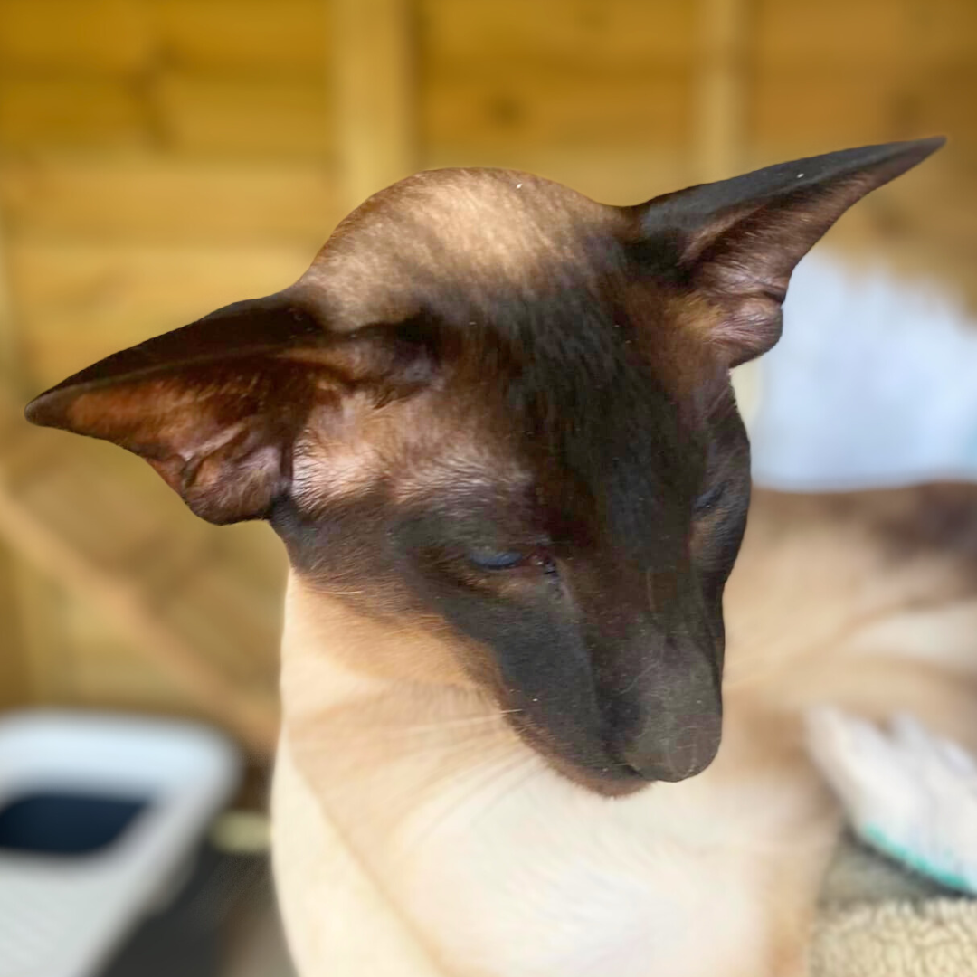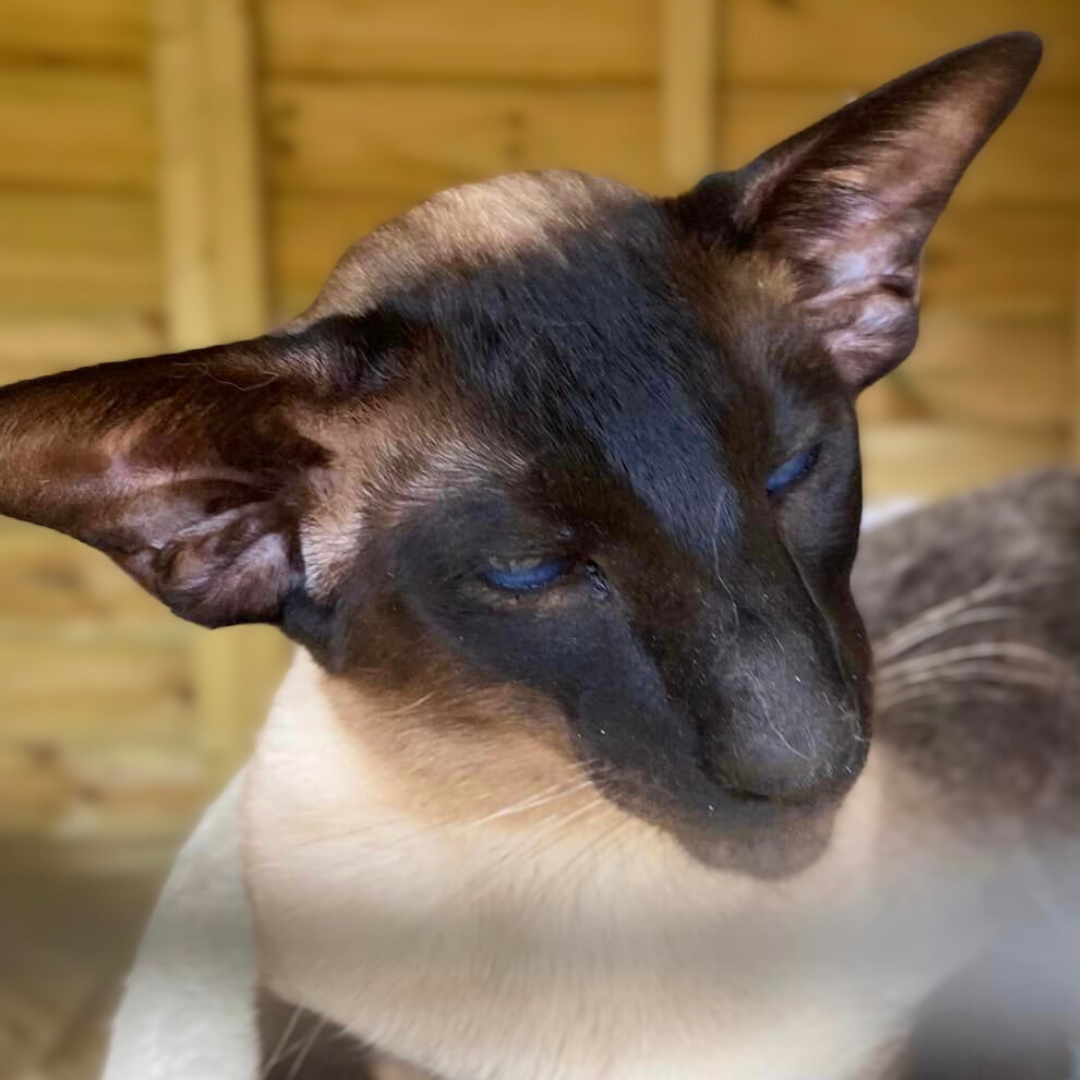 Bruno is our seal point Siamese boy and is available at stud to tested and approved girls. He is a huge friendly boy with a soppy temperament which he passes on to his kittens. Bruno carries chocolate and dilute and is tested negative for PRA..