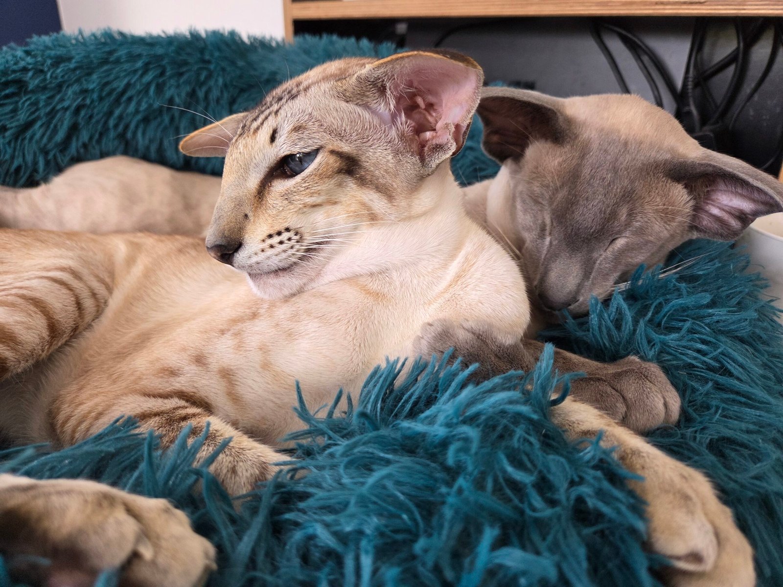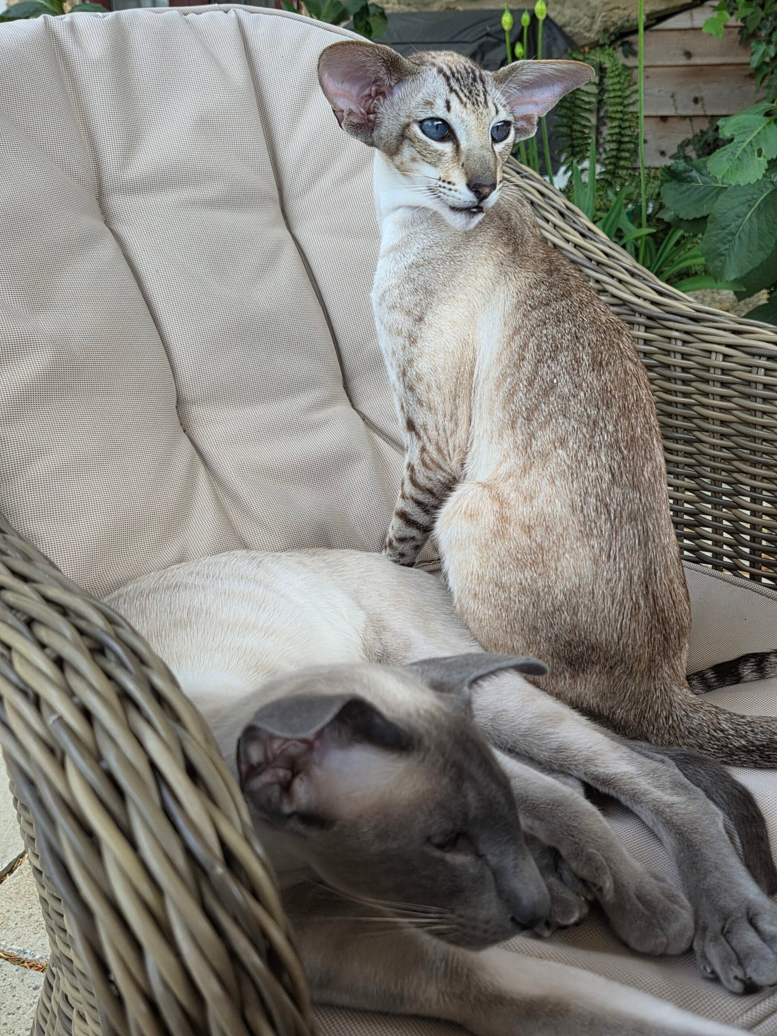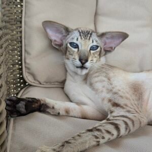 Stripe carries the genes for dilute color and the classic/blotched Oriental tabby pattern, offering beautiful possibilities for his progeny.